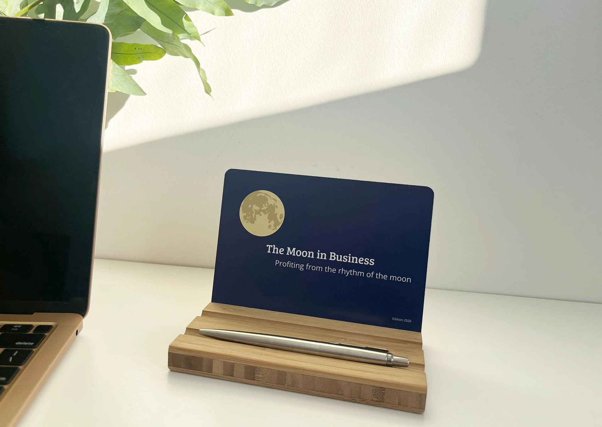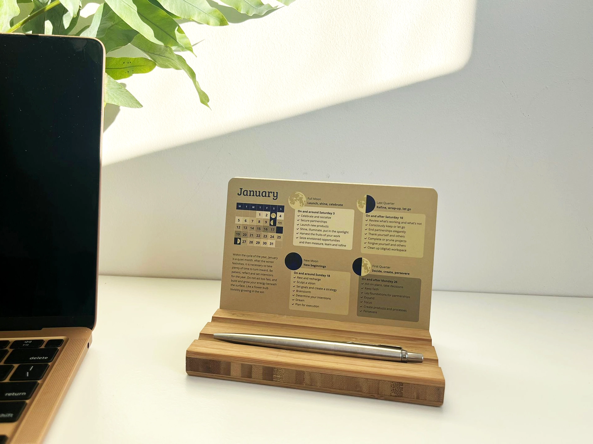 Binnenkort verwachten we de Nederlandstalige versie van deze maankalender voor zakelijk gebruik, editie 2026. Inclusief Scandinavische stijl bamboe standaard met twee inkepingen voor pennen of potloden (pennen en potloden niet inbegrepen). Elke maand toont een checklist met zakelijke activiteiten om optimaal te laten samenvallen met de vier belangrijkste maanfasen.